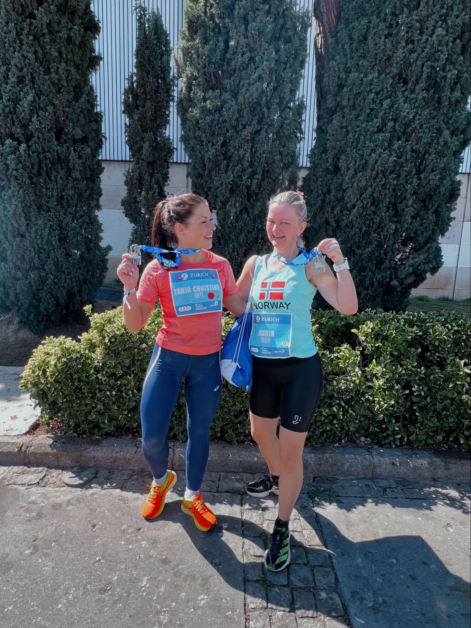 Jag var så nöjd och glad. Jag hejade inombords, och i mål kunde jag fira med Ine, och så småningom träffade vi de andra maratonlöparna – passform Nina, Kine, Tanja och hennes kompisar. Det var helt rått! Vilket vi njöt av.